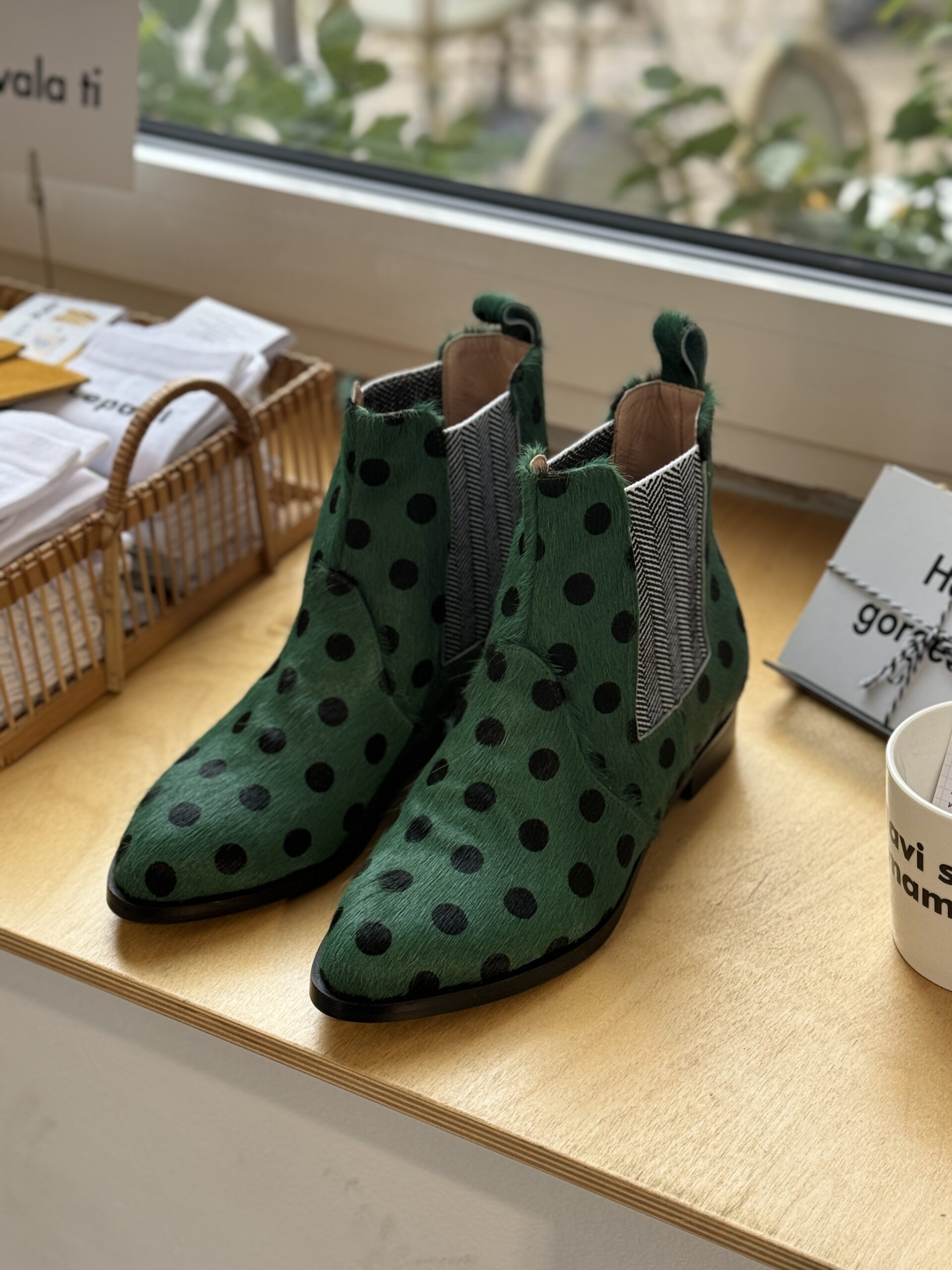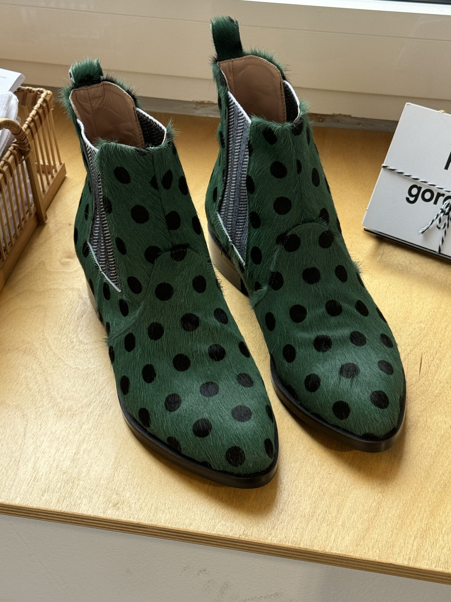 A redefined classic cut. Green pony leather with black polka dots, and black and white elastic to compliment the green. Fun fact: they’re water resistant!